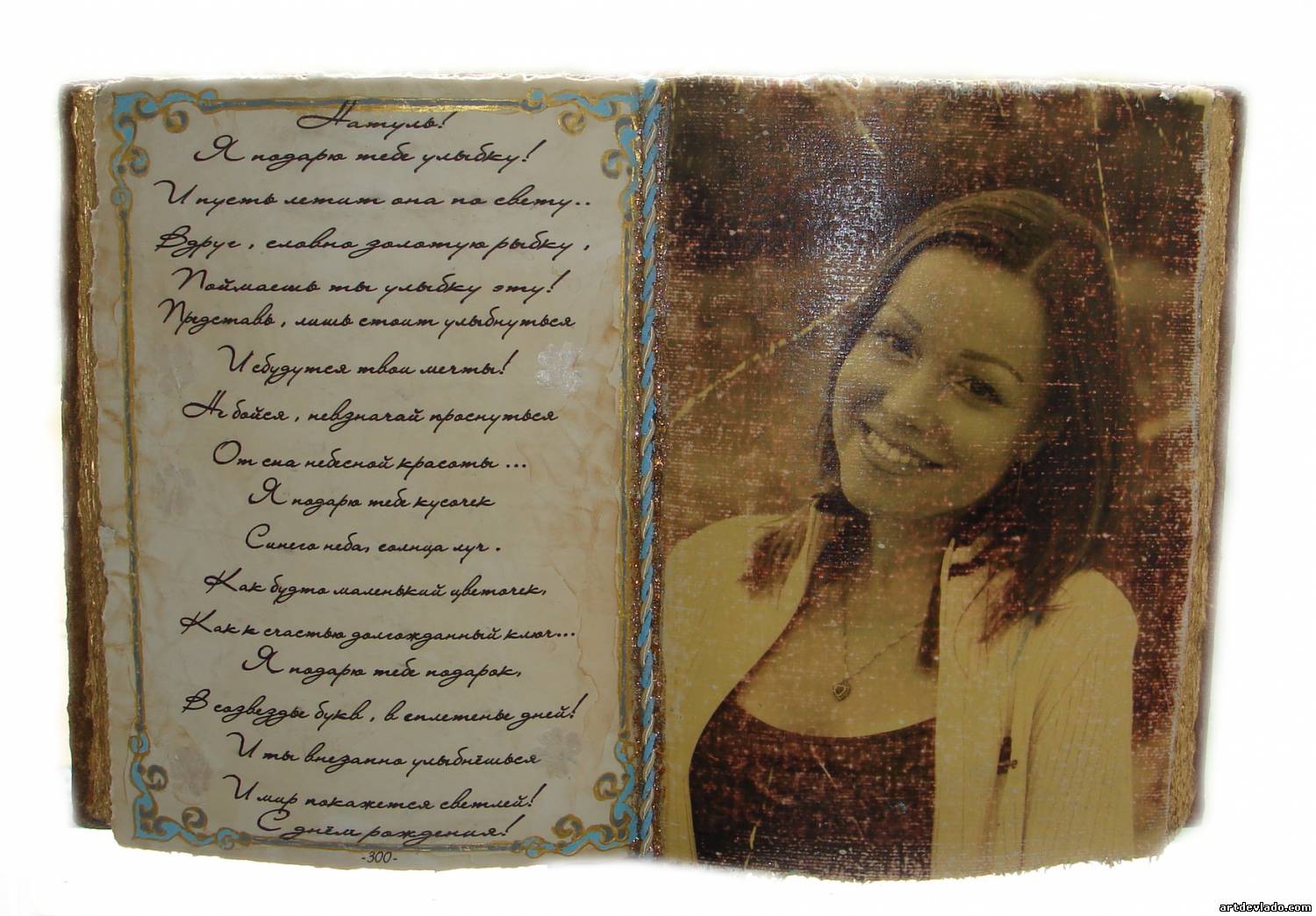 Имитация книги в развёрнутом виде,слева поздравительный текст,справа фотография имениника нарисованая карандашом